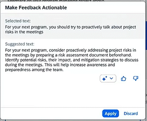 When it came to the talent demos, we saw examples where AI helps you quickly complete feedback tasks, write performance reviews etc. I thought that one of the most useful demos was the AI feature that rewrites your feedback into actionable feedback. This makes it more valuable to the receiver, and it’s often hard to write yourself.