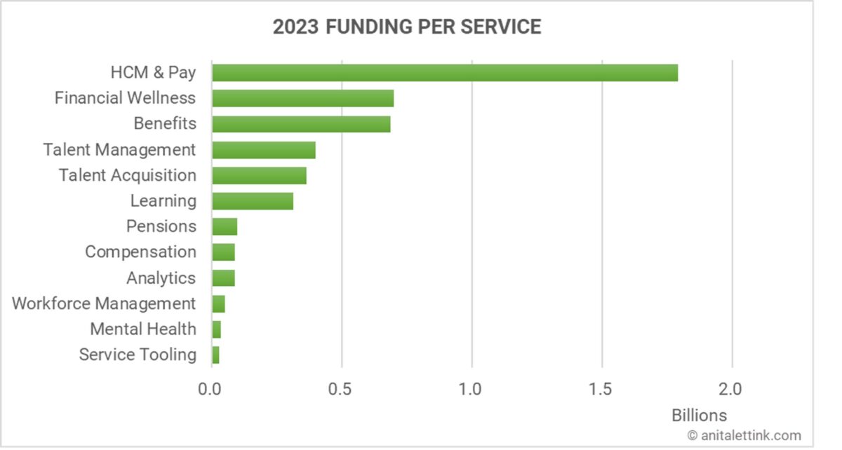 - Service-Specific Funding: The distribution of funds across various HR services indicates a strong emphasis on administrative and financial services to support the employer-employee relationship. HCM & Pay (with a focus on solutions for local markets), Financial Wellness, and Benefits were the categories that attracted the most funding.