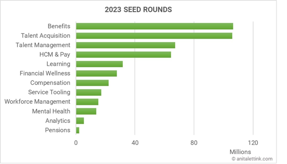 Last year, the top 3 funded services were Talent Acquisition, Talent Management, HCM & Pay. In 2023, Benefits just beat Talent Acquisition to the top spot, followed by Talent Management. Benefits startups often deliver specialty services, with a focus on e.g. mobility, bereavement, or reproductive services. And while the average investment in seed rounds is $3.4M, I noticed that Benefits founders attract almost double that amount, at an average of $5.9M per round.
