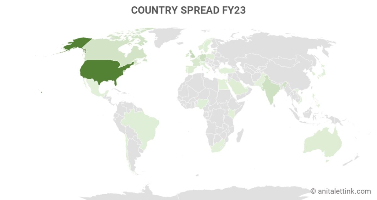The dominance of the US in funding rounds stands out, but it is also declining year over year, and in 2023, 61% of funding rounds took place outside of the US. The US is a great environment for startups. Many companies that were founded elsewhere move their headquarters there once they are ready to raise funds.