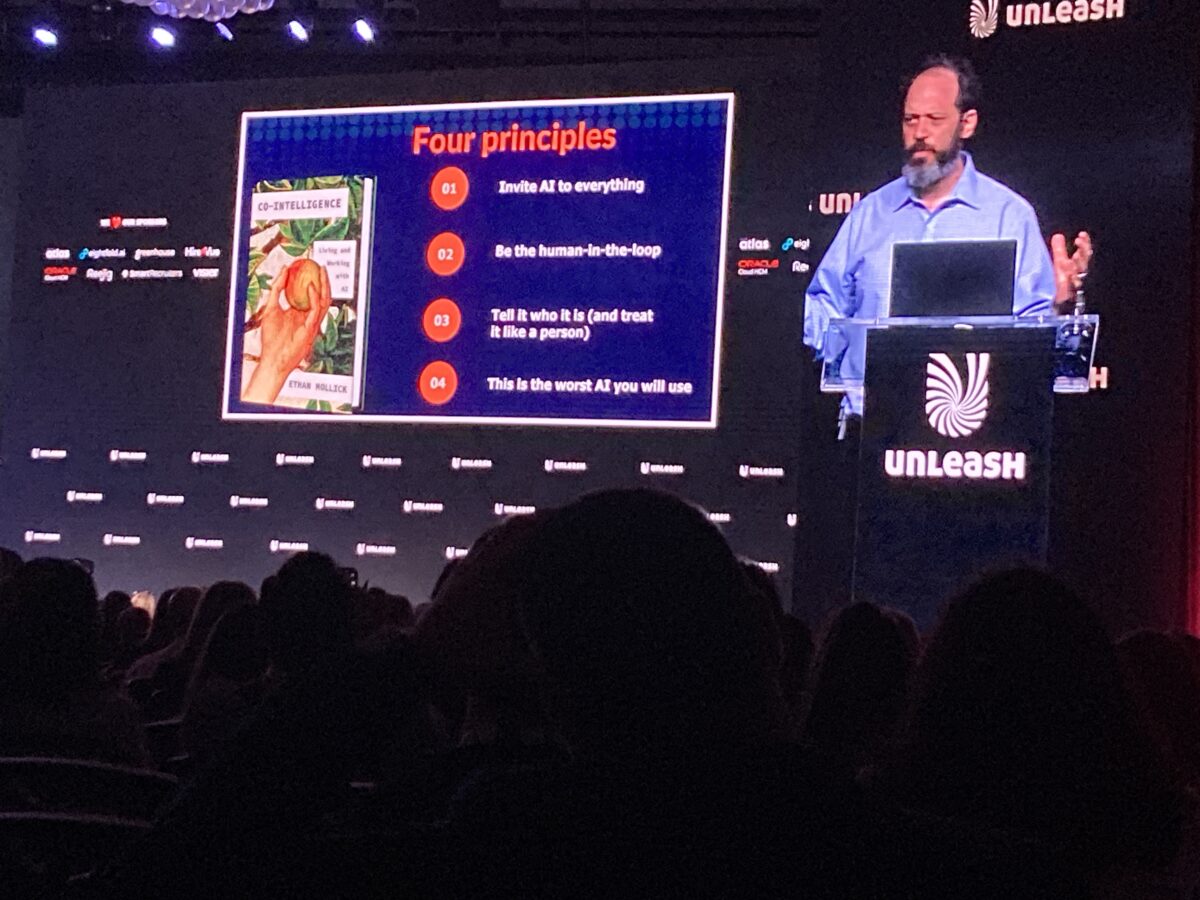 âYou canât trust anything see you online every again!â The opening keynote was led by Ethan Mollick, who dazzled the audience not only with stats, but with a real-time AI demonstration! The idea that AI can enhance human performance by eliminating mundane tasks and amplifying our innate capabilities is something he touched upon several times. And he showed it by creating a business plan with several iterations using AI tools while he was speaking. He also gave some examples of how these GenAI applications can boost performance, with the largest performance gains to be had by bottom performers. His recommendation was to divide work in three buckets: Human Only, Centaur & Cyborg tasks, Delegated to Agents. And I think that every company should have started on this by now. Because if you havenât, youâll end up with the Secret Cyborg problem: employees using GenAI apps in secret. And that can lead to a host of other issues! I’ll leave you with a picture of the Four Principles that he shared: